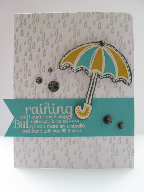 I was mostly inspired by the colors of this album cover, so love this color combo! I stamped the rain drops in london fog ink by memento all over the card, heat embossed with white powder the umbrella and the fantastic sentiment! Added some large doodlebug jewels!
