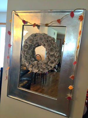 I made a fall garland by gluing more leaves on some twine! (I used hot glue it works the best) Looking around my house I decided the best place to put this twine was on this mirror. I realize I should hang the fall wreath than the garland but this paper wreath is here to stay on this mirror (after falling and breaking several times I've finally adhered it right to the mirror and it won't be moving! LOL)